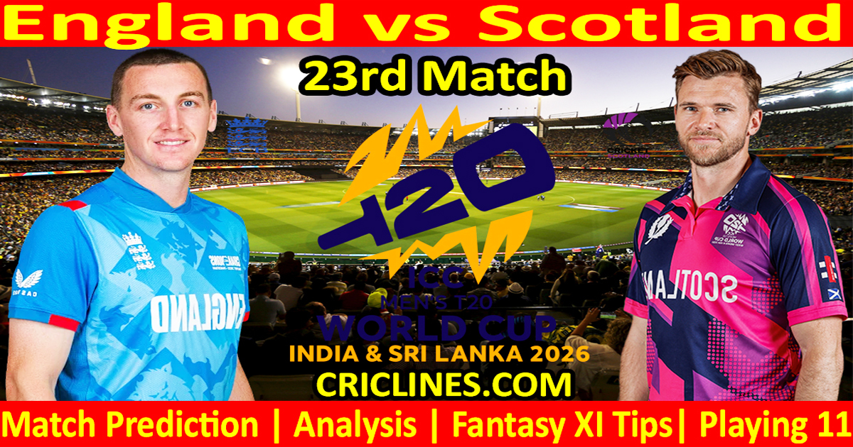England vs Scotland 23rd Match World Cup 2026 Dream11 today match prediction. World Cup T20. Who will win today match ENG vs SCO? We provide 100 % sure today cricket match prediction tips by Raja Babu with Dream11 Fantasy Team Prediction. World Cup toss prediction. Live score with the ball-by-ball update. Cricket toss prediction.