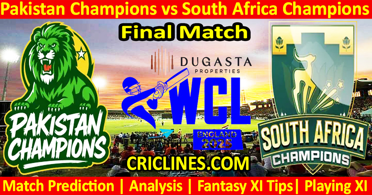 Pakistan Champions vs South Africa Champions Final match prediction. World Championship of Legends T20, 2025. We provide 100 % sure today cricket match prediction tips by Raja Babu and today prediction. Who will win today match PAKC vs SAC? Live score with the ball-by-ball update. Cricket toss prediction free.