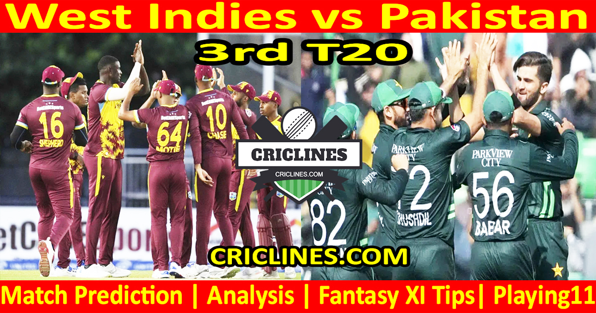 West Indies vs Pakistan 3rd T20 2025 today match prediction. We provide 100 % sure today cricket match prediction tips and dream11 team by Raja Babu. Who will win today match WI vs PAK? Live score with the ball-by-ball updates. Cricket toss prediction free.