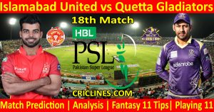 The world is ready to witness yet another big battle of PSL T20. The 18th Match of Pakistan Super League 2021 is scheduled to play between Islamabad United and Quetta Gladiators on Friday, 11th June 2021 at Sheikh Zayed Stadium, Abu Dhabi. We are posting safe, accurate, and secure today match prediction for all matches of PSL free.
